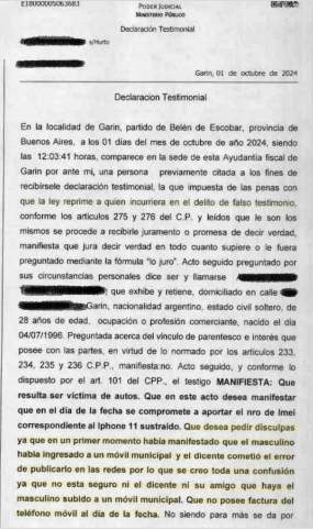 Finalmente, se cita al damnificado a declarar y éste manifiesta que: «desea pedir disculpas ya que había denunciado que el ladrón había subido a un móvil municipal, y que además cometió el error de publicarlo en las redes escrachando falsamente a un agente ya que no está seguro ni él ni su amigo que eso haya sucedido en realidad.»
