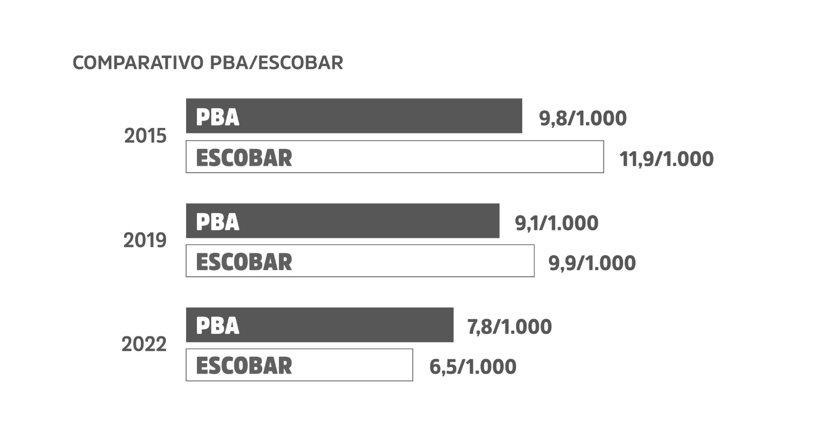 Según registros oficiales, entre 2015 y 2022 (último año con cifras procesadas), Escobar logró un descenso sustancial de mortalidad infantil en todo el distrito. Los datos brindados por el Ministerio de Salud de la provincia de Buenos Aires muestran una disminución de un 44% en siete años.