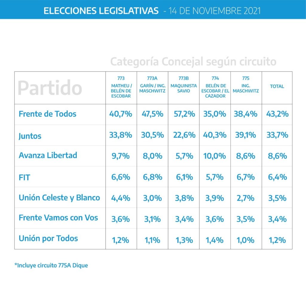 Con respecto a las PASO, la lista encabezada por María Laura Guazzaroni creció en las cinco secciones electorales del distrito: ganó con holgura en Maquinista Savio (34.6 puntos de diferencia) y Garín (17 de ventaja), mejoró también su victoria en Matheu (7 puntos), logró un empate técnico en Ingeniero Maschwitz (0,7 a favor de Juntos) y en Belén de Escobar redujó a cinco unidades la distancia con Roberto Costa. De esta manera, el espacio de Sujarchuk ganó seis concejales y se aseguró la mayoría en el Concejo Deliberante, con 14 ediles propios sobre los 24 que conforman el Legislativo local.